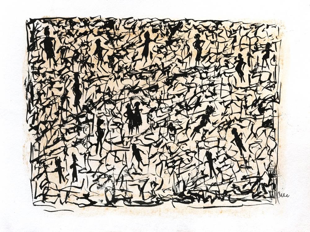 Cet ensemble d'œuvres sur papier intitulé "Scriptoglyphes" de Jean-Jacques Marie se distingue par la répétition méticuleuse de formes, signes, symboles, idéogrammes et silhouettes anthropomorphes. Chaque élément graphique, soigneusement sélectionné, crée une cadence visuelle harmonieuse captivante. Cette répétition devient un procédé créatif unique, comparable à une écriture impulsive et naturelle, imprégnée d'imaginaire et de rêve, née de l'émotion pure de l'instant.